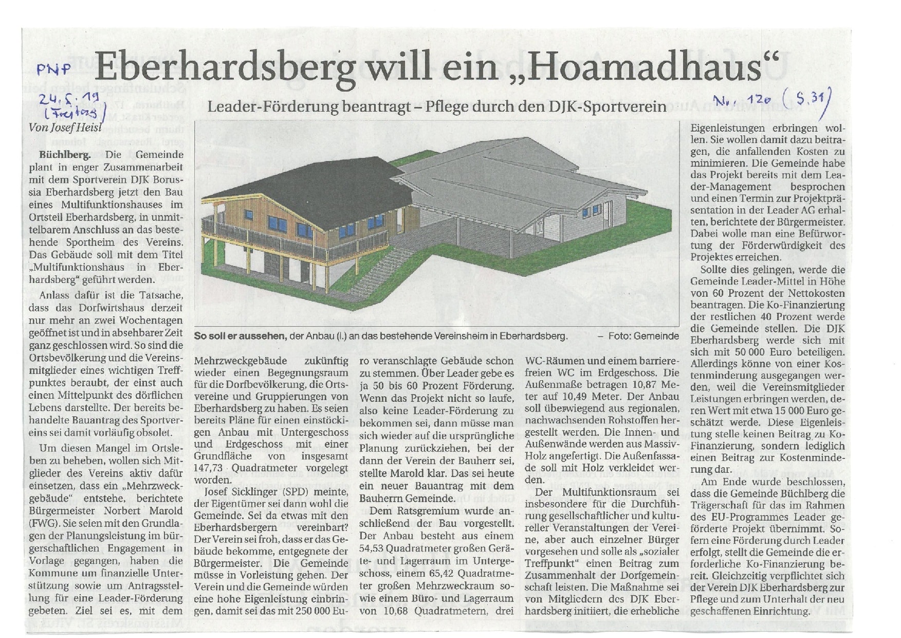 Die Gemeinde Büchlberg errichtet in Eberhardsberg ein Mehrzweckgebäude. Unter dem Vorbehalt der Bereitstellung von öffentlichen Fördermitteln (Leader-Förder-Programm) beabsichtigt die Gemeinde im November 2019 mit dem Bau zu beginnen: